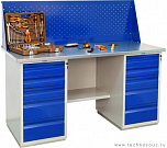 Двухтумбовый. Допустимая нагрузка на столешницу 1000 кг. Опорные элементы выполнены сварными из холоднокатаной стали. Для выполнения сборочных, ремонтных, слесарных, монтажных и других видов работ на производстве, в сервисных центрах, мастерских, гаражах, а также для обучения технологии в учебных заведениях. Комплектуется полкой-стенкой, расположенной под столешницей для удобного размещения габаритного инструмента и оснастки. Размеры верстака: 855x1596x696 мм. Вес: 98 кг. Поставляется в 4 комплектациях на выбор.