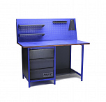 Однотумбовый. Допустимая нагрузка на столешницу 750 кг. Опорные элементы выполнены сварными из холоднокатаной стали. Верстак состоит из столешницы, опоры, тумбы P3 с тремя большими ящиками, полки-стенки и одинарного экрана с кронштейнами. Все металлические элементы покрыты полиэфирной порошковой краской. Столешница состоит из фанеры марки ФСФ толщиной 24 мм, которая покрыта лаком-антисептиком и листом оцинкованной холоднокатаной стали толщиной 1,2 мм. Размеры (ВхШхГ) 1470x1396x696 мм.