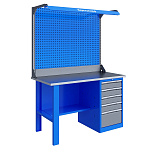 Однотумбовый. Допустимая нагрузка на столешницу 750 кг. Опорные элементы выполнены сварными из холоднокатаной стали. Верстак состоит из столешницы, опоры, тумбы P5 с четырьмя малыми и одним большим ящиком, полки-стенки, двойного экрана с кронштейнами и комплекта освещения. Столешница состоит из фанеры марки ФСФ толщиной 24 мм, которая покрыта лаком-антисептиком и листом оцинкованной холоднокатаной стали толщиной 1,2 мм. Размеры (ВхШхГ) 1965x1396x696 мм.