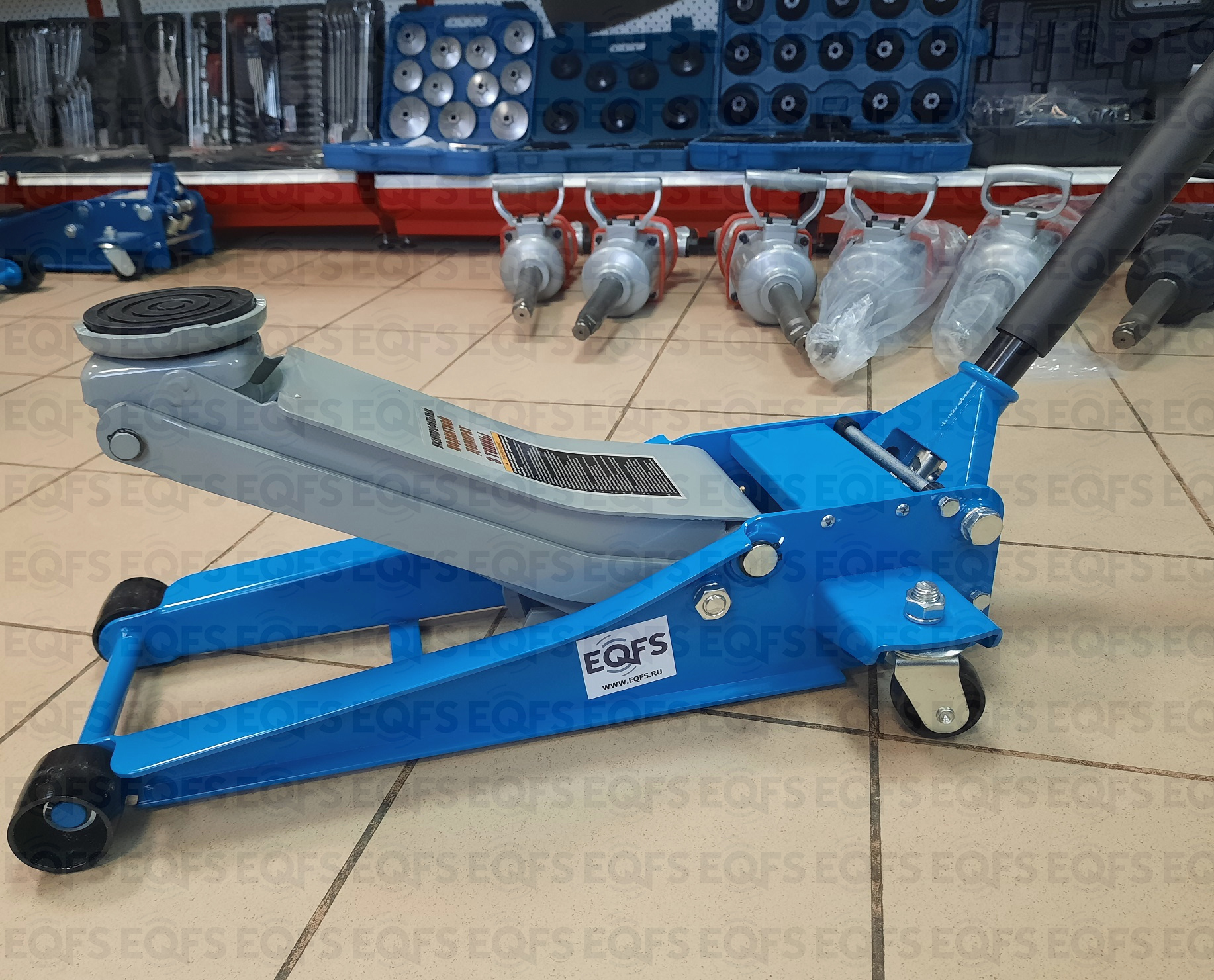 Домкрат подкатной low profile рекомендуется к применению в шиномонтажных мастерских и автосервисах для поднятия автомобилей с низким клиренсом. Цвет темно-синий.